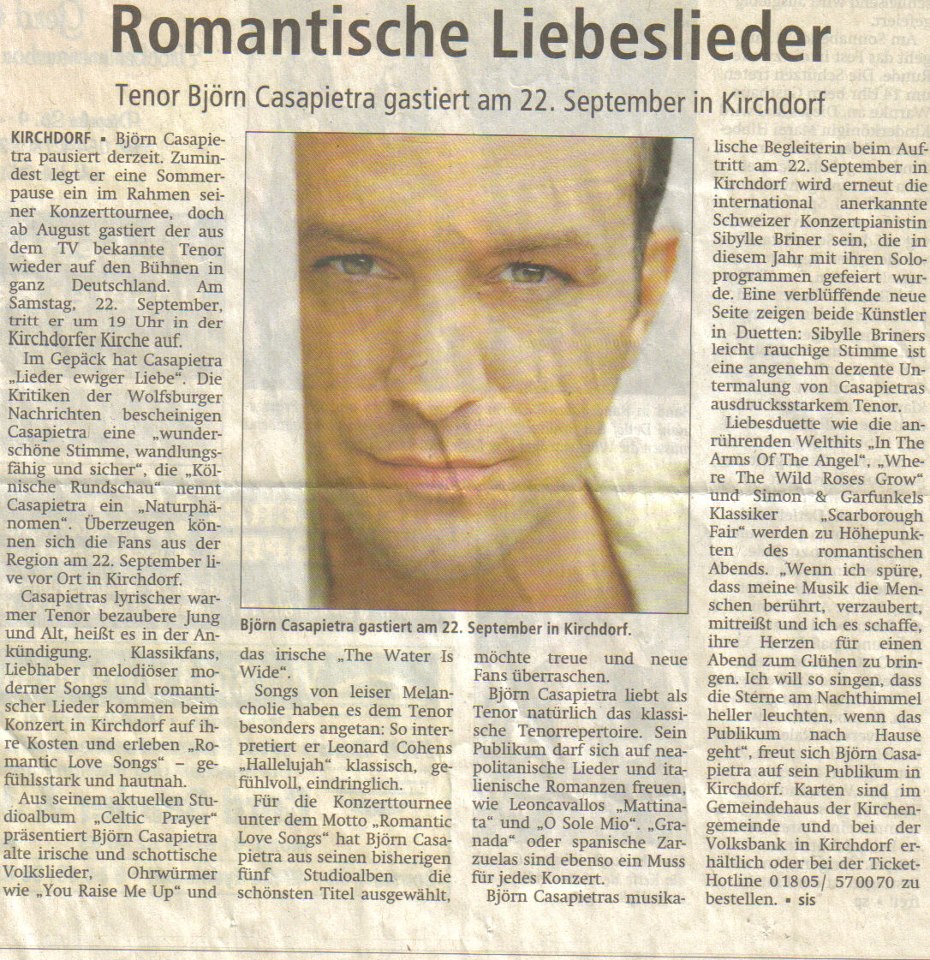 Hier ein schöner Zeitungsbericht über die Vorankündigung eines bevorstehenden Konzertes in Kirchdorf ( bei Sulingen) am 22.9.2012 um 19 Uhr