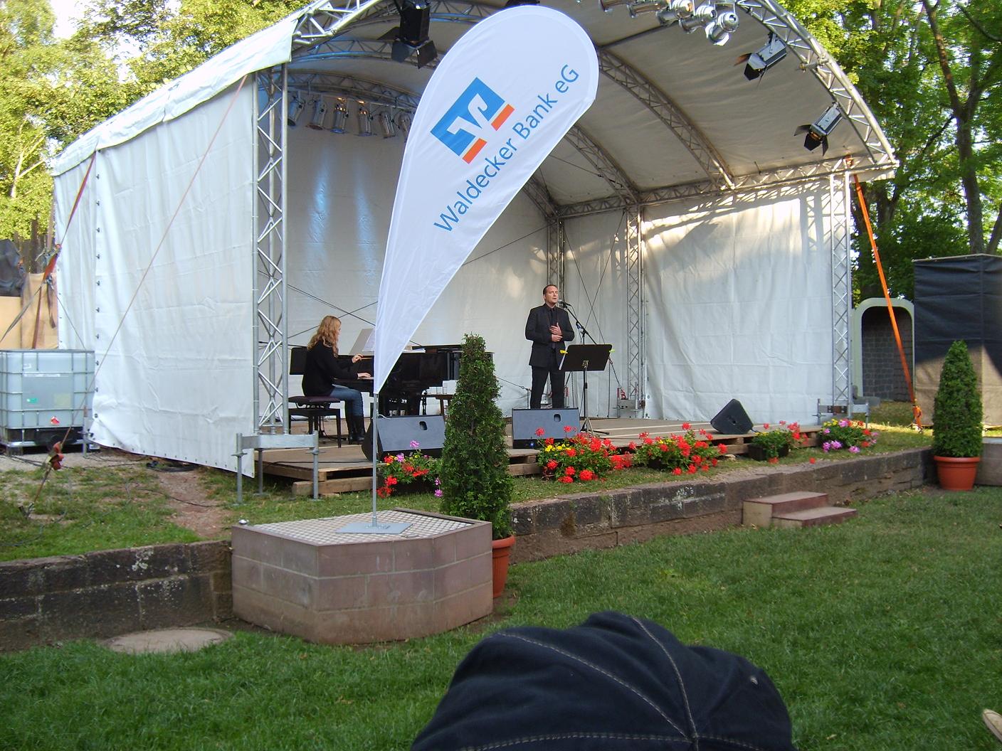 Altstadtfestkulturwochenende in Korbach. Das open-air-Konzert mit Björn Casapietra wurde auf extra plakatiert angekündigt. Freilichtbühne. Wettervorhersage nicht so erfreulich. Abends sinken auch noch die Temperaturen. Damit stand fest, dass die Verpackung stimmen muss. Dazu gehören Decken, Regenjacke und kleine Überraschungen. Passte glücklicherweise alles in die große Tasche. Dann ging es los. Vom Hotel in Richtung Freilichtbühne. Es war schon eine Menge dort los. Mit unseren Karten in der Hand suchten wir unsere Plätze. Was war das? Der Sitzplan im Internet stimmte nicht mit den Örtlichkeiten überein. Gerd und ich fanden uns dann am anderen Ende der Bankreihe wieder. Kein Problem. Wir konnten trotzdem sehr gut sehen.