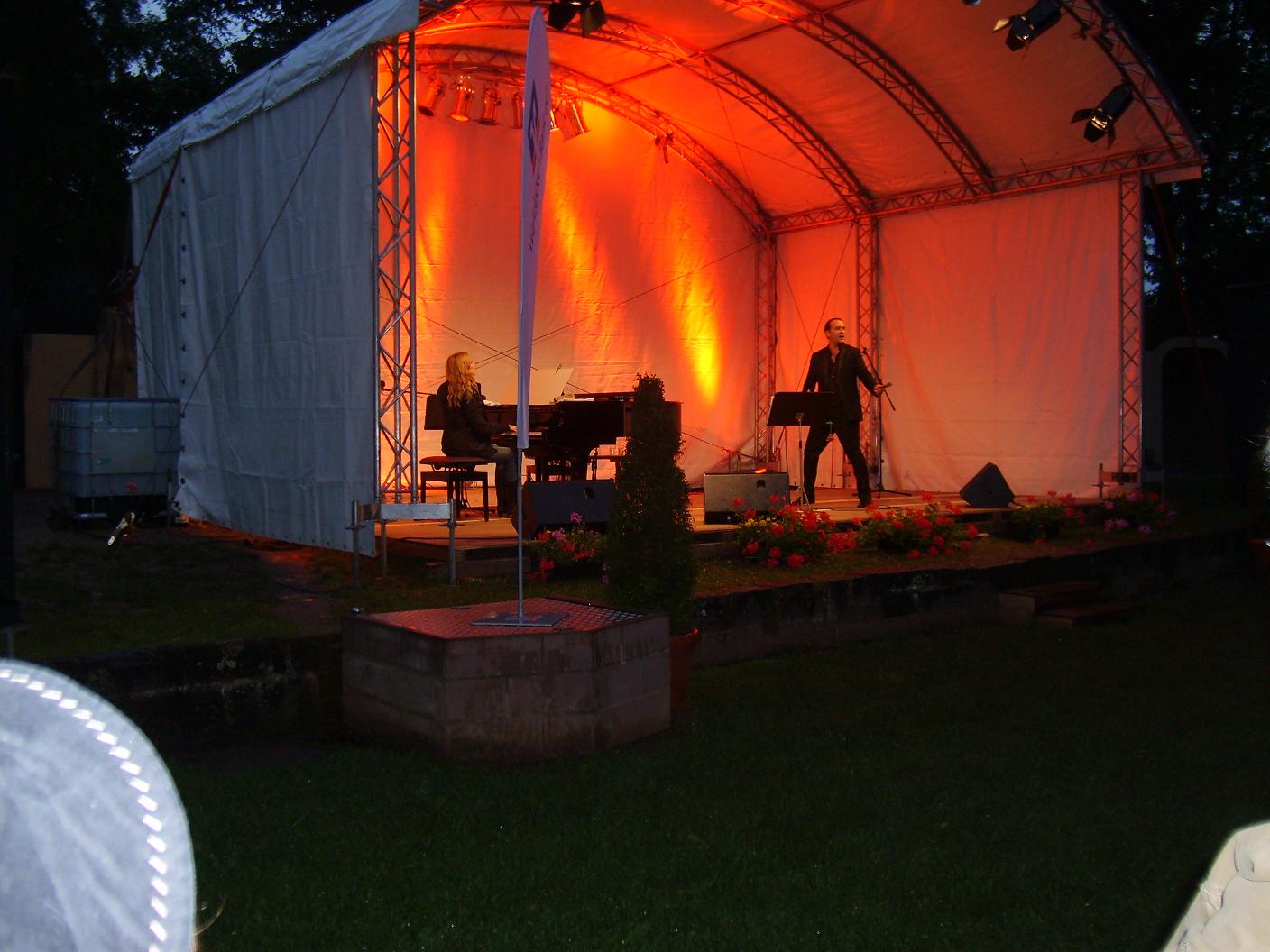 Dann gab Björn nochmal ordentlich Gas und bezog die Besucher mit "O SOLE MIO" und "FUNICULI, FUNICULA" in einen Rauschzustand. Vergessen war der Wolkenbruch und die durchnässte Kleidung. Die Besucher wollten die Künstler nicht gehen lassen und errangen etliche Zugaben. Ein Abschiedsgeschenk für Björn und Sibylle kam bei dem Lied "YOU RAISE ME UP". Mit Wunderkerzen und einer Lichterkette bedankte sich das Publikum für den außergewöhnlichen Abend.