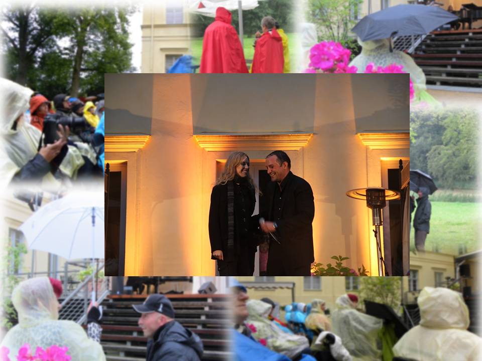 Björn setzte sehr gefühlvoll das Lied "IN THE ARMS OF AN ANGEL" an. Ein ganz bezaubernder Song. In der Sekunde schoben sich alle schwarzen Wolken über der Freilichtbühne zusammen und es regnete. Es regnete richtig. Björn sang weiter. Da nicht alle Besucher das Glück hatten, geschützt zu sitzen, begann eine regelrechte Völkerwanderung. Björn sang weiter. Die Regenjacken wurden ausgepackt, die Regenschirme aufgespannt und sich so gut es ging ins Trockene gebracht. Björn sang weiter. Alles nass. Sibylles Finger auf den Tasten hatten Schwerstarbeit zu leisten. Trotzdem blieb das Pumblikum, jedoch jetzt teilweise an anderer Stelle.