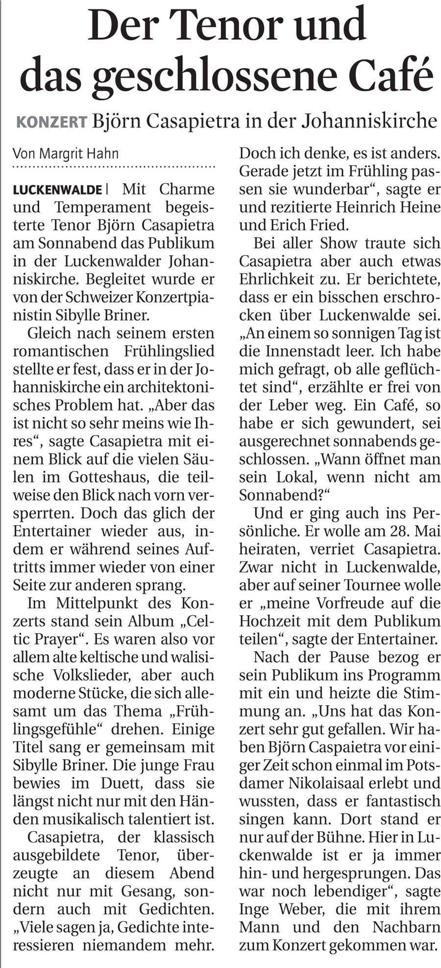 Eigentlich wollte ich zum Konzert in Luckenwalde ausfuehrlicher schreiben; aber es ist voellig unnoetig ! So wie Margit und Catharina ihre Eindruecke zu Freiberg beschrieben - und man setzt dafuer "Luckenwalde" ein - so war es gestern; oder wie Marina sagt: Sternstunde!