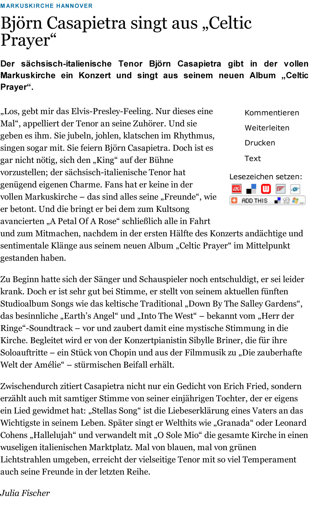 Artikel zum Konzert in Hannover