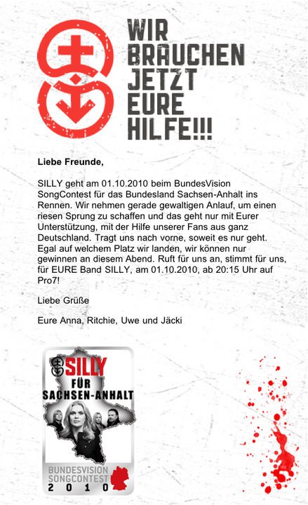 mich wundert es ja ein wenig, warum silly für sachsen-anhalt startet, denn ich weiß nicht was sie mit diesem bundesland verbindet, aber egal, da ich in sachsen-anhalt lebe, ist es ehrensache für mich für silly zu stimmen. wünsche ihnen viel erfolg heute abend!
