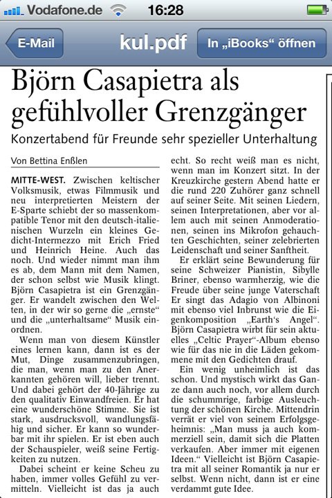 es sind zwei kritiken erschienen zum konzert in wolfsburg. die sind beide so der hammer das ich total gerührt bin. total berührt. kann mein glück gar nicht fassen. werd sie hoffentlich morgen als pdf haben und hier posten.