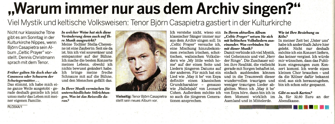 Dieses schöne Interview zum anstehenden Konzert in Köln am 12.09., im Rahmen der "Celtic Prayer" Tour, ist heute in der "Kölnische Rundschau" erschienen!