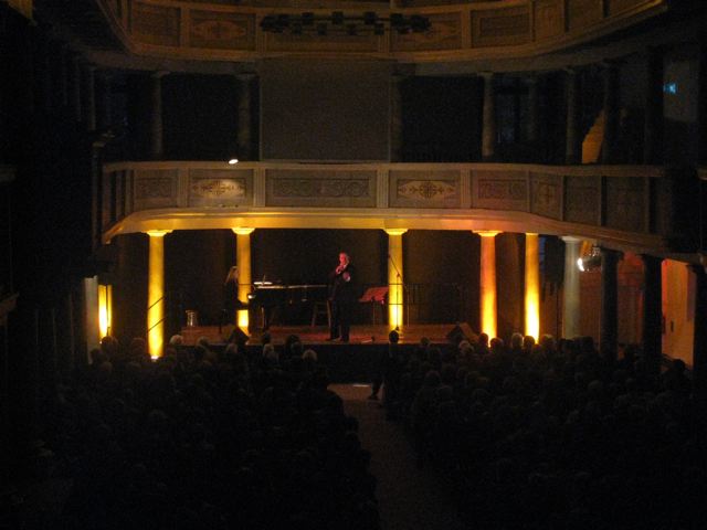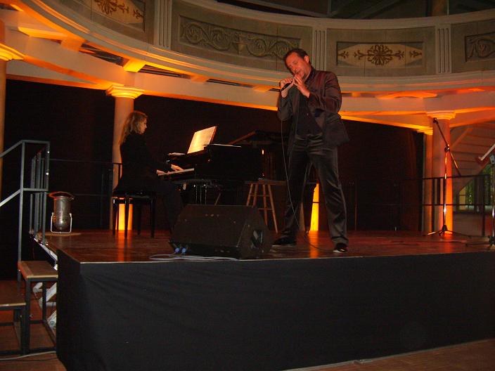 Sonntag, d. 30.05.10, 19:30 Uhr. Der Saal war mittlerweile proppe voll. Ich schätze mal, so an die 300 – 350 Besucher. Wie auf Kommando trat merkliche Stille ein. Die Beleuchtung wurde herunter gefahren und…………………und………………und…………………nichts geschah! Es mögen vielleicht nur einige wenige Sekunden gewesen sein; in der inneren wohltuenden Erwartung als Zuschauer kam es einem trotzdem wie Stunden vor. Wie aus dem Nichts heraus betrat Sibylle Briner, die Pianistin, die Bühne und begann, dem Klavier die ersten zarten Töne zu entlocken. Das lenkte die Zuhörer natürlich ab. Plötzlich stand Björn am Mikrofon und hatte sofort die ungeteilte Aufmerksamkeit der Besucher.