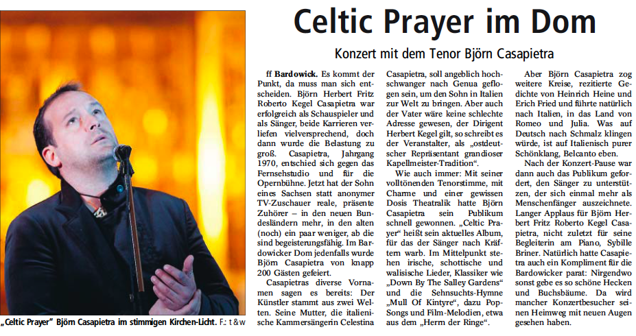 Normalerweise hören wir Musik von ACDC, Metallica u.ä., aber wir wollten auch mal etwas anderes ausprobieren. Haben es dieses Jahr schon mit Oper (Zauberflöte) versucht, aber das war nicht unser Ding (zu viele schrille Frauenstimmen)... Dann habe ich gelesen, daß "einer" in Bardowick keltische Lieder singen will und habe meinen Mann überzeugt, es noch einmal zu versuchen... Und es war der Hammer!! Bei den ersten Stücken lief mir eine Gänsehaut nach der anderen über den Rücken und auch mein Mann war ganz verzaubert!!! Schade nur, daß Uwe Hassbecker sein Gitarrensolo nicht zum besten gegeben hat und wir persönlich hätten gerne noch Mull of Kintyre gehört, aber man kann ja nicht alles haben... Wir hören natürlich immer noch ACDC u.ä., aber jetzt gehört auch eine Casapietra-CD zu unserer "Sammlung"!! Vielen Dank für den sehr schönen - anderen - Abend!!!