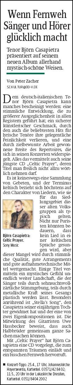 Eine hervorragende Rezension zu "Celtic Prayer" heute in der Sächsischen Zeitung