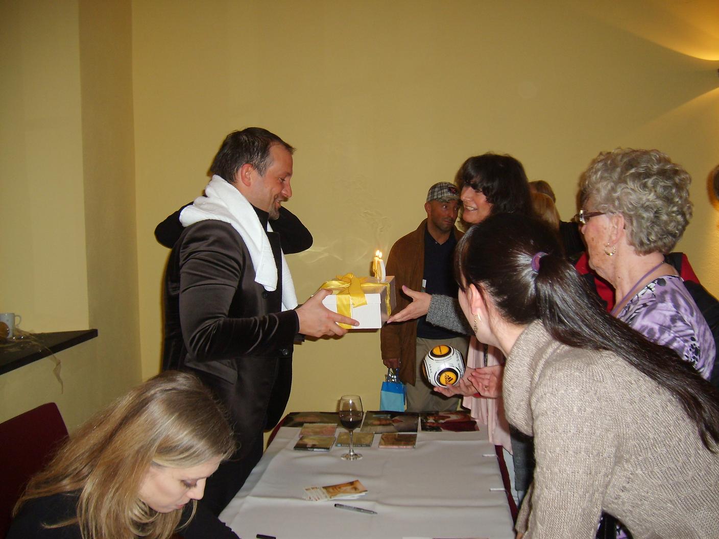 Völlig durchgeschwitzt und mit einem Handtuch um den Hals begleitet, gingen Björn und Sibylle zum Autogrammtisch. Dort warteten schon viele Leute mit der neuen CD in der Hand. Kurz vor Ende der Autogrammstunde sah ich zwischen dem ganzen Gewühl Kerzen leuchten. Einige Casapietra Freunde haben Björn noch nachträglich zum Geburtstag gratuliert. Björn hat sich sichtlich gefreut und war gerührt.