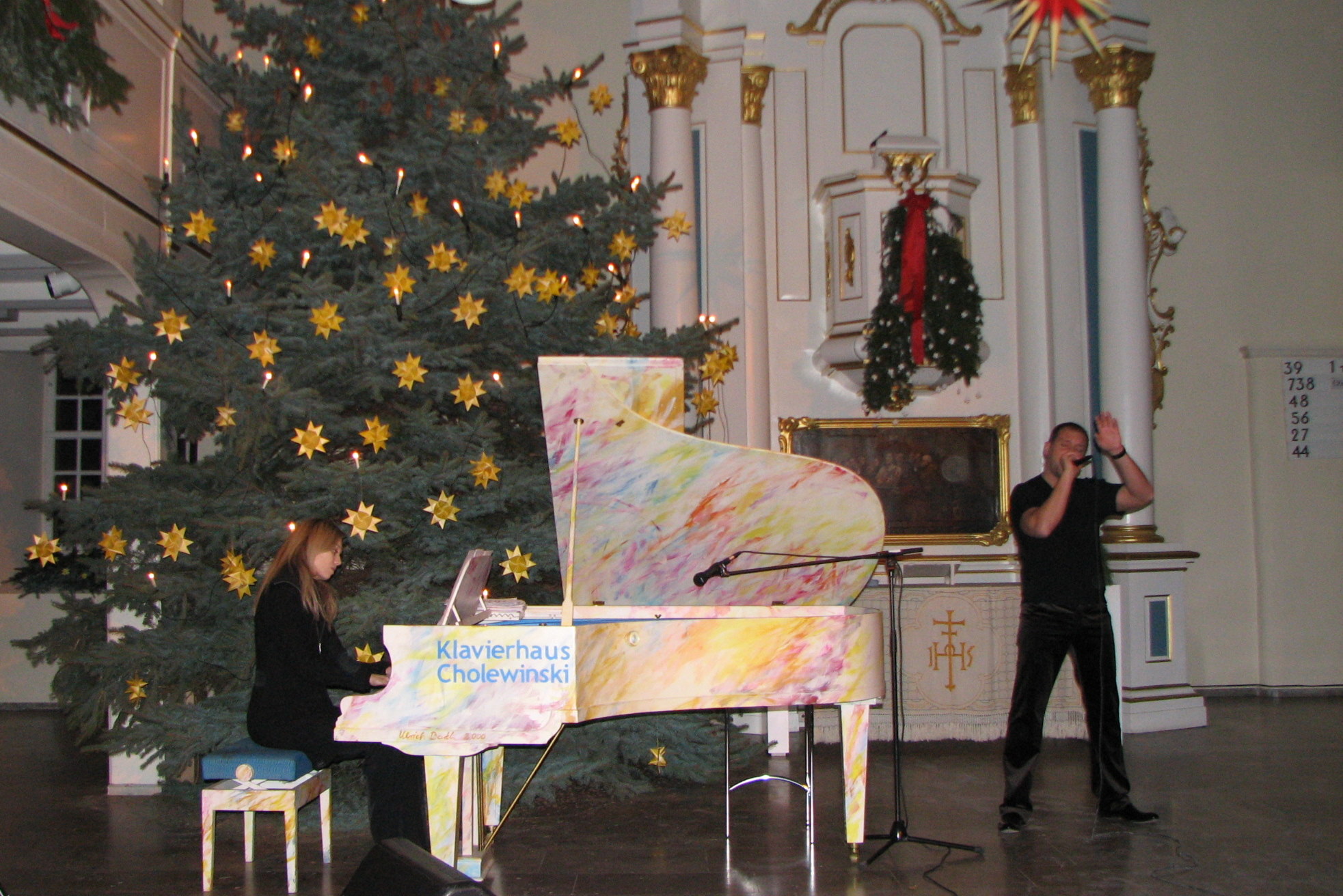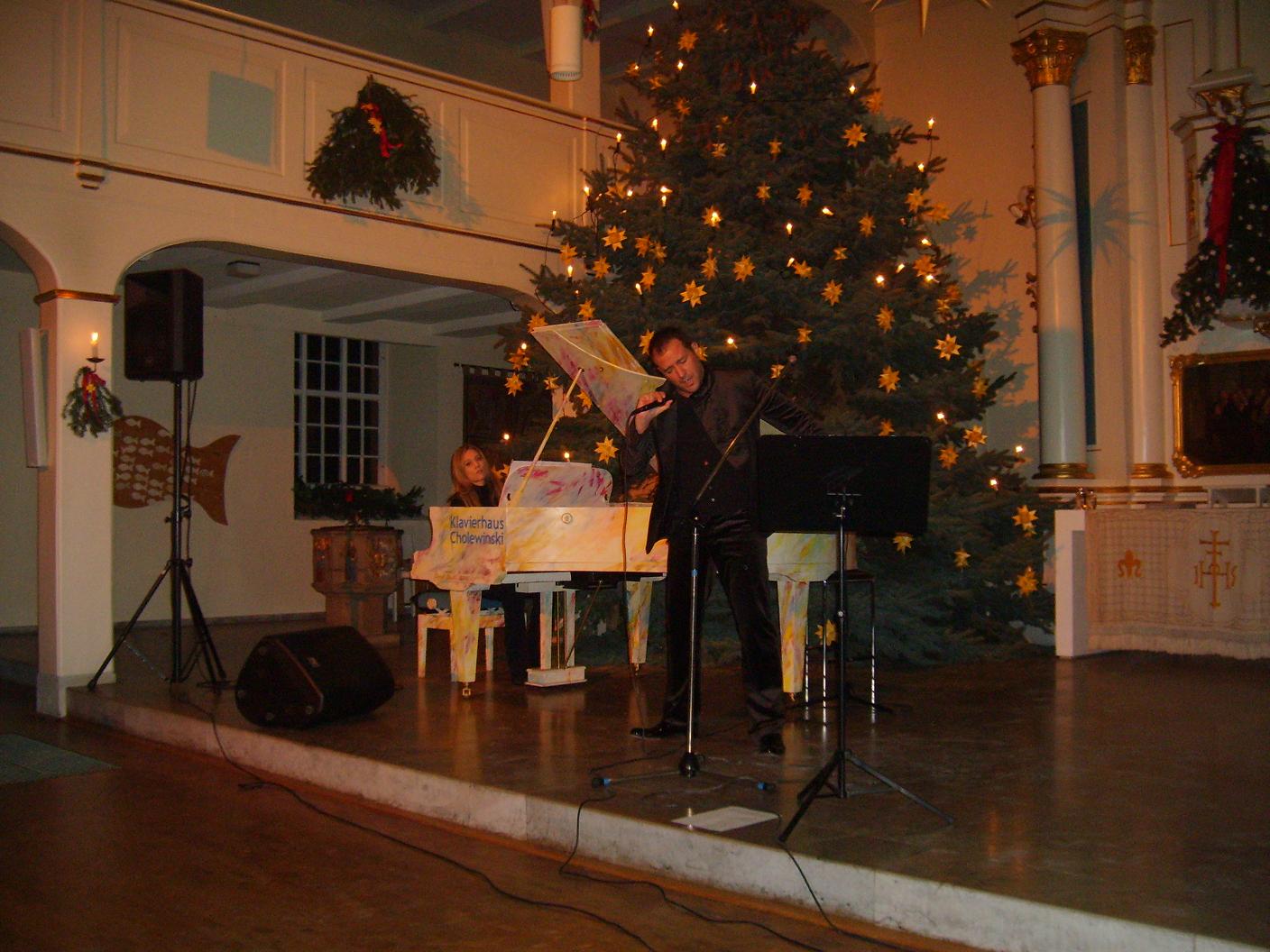 Björn kam gegen halb fünf und sein Weg führte sofort in die Kirche, um „die Bühne“ in Augenschein zu nehmen. Da war sie wieder, die vertraute Umgebung. Der bunte Flügel wartete neben einem riesigen und wunderschön schlicht geschmückten Weihnachtsbaum ungeduldig auf Sibylle. Die Kirche war dieses Mal auch schön kuschelig warm. Sah und fühlte sich also im ersten Moment alles gut aus und an. Halt, was war denn da mit dem einen Lautsprecher los? Da kommt ja überhaupt kein Ton raus!!! Ein Techniker musste her. Die Beleuchtung fand auch nicht gerade Björns sofortige Zustimmung. Nach einigen unwesentlichen Umbauarbeiten und unbedeutenden Korrekturen an den Lichteffekten konnte der Sound check beginnen.