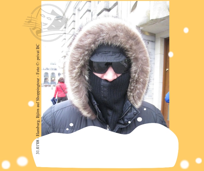 <<<hier zeigt Björn , wie man/Mann sich richtig warm verpacken sollte, bei dieser Eiskälte!