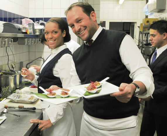 „Arbeitswege frei halten, bitte!“ ruft Schauspieler und Tenor Björn Casapietra mit Tabletts auf den Händen – er gibt auch im Küchendress eine gute Figur ab. Casapietra engagierte sich stundenlang als Koch und Ober und war erst kurz vor Mitternacht dazu zu bewegen, selbst mal einen Happen zu probieren.