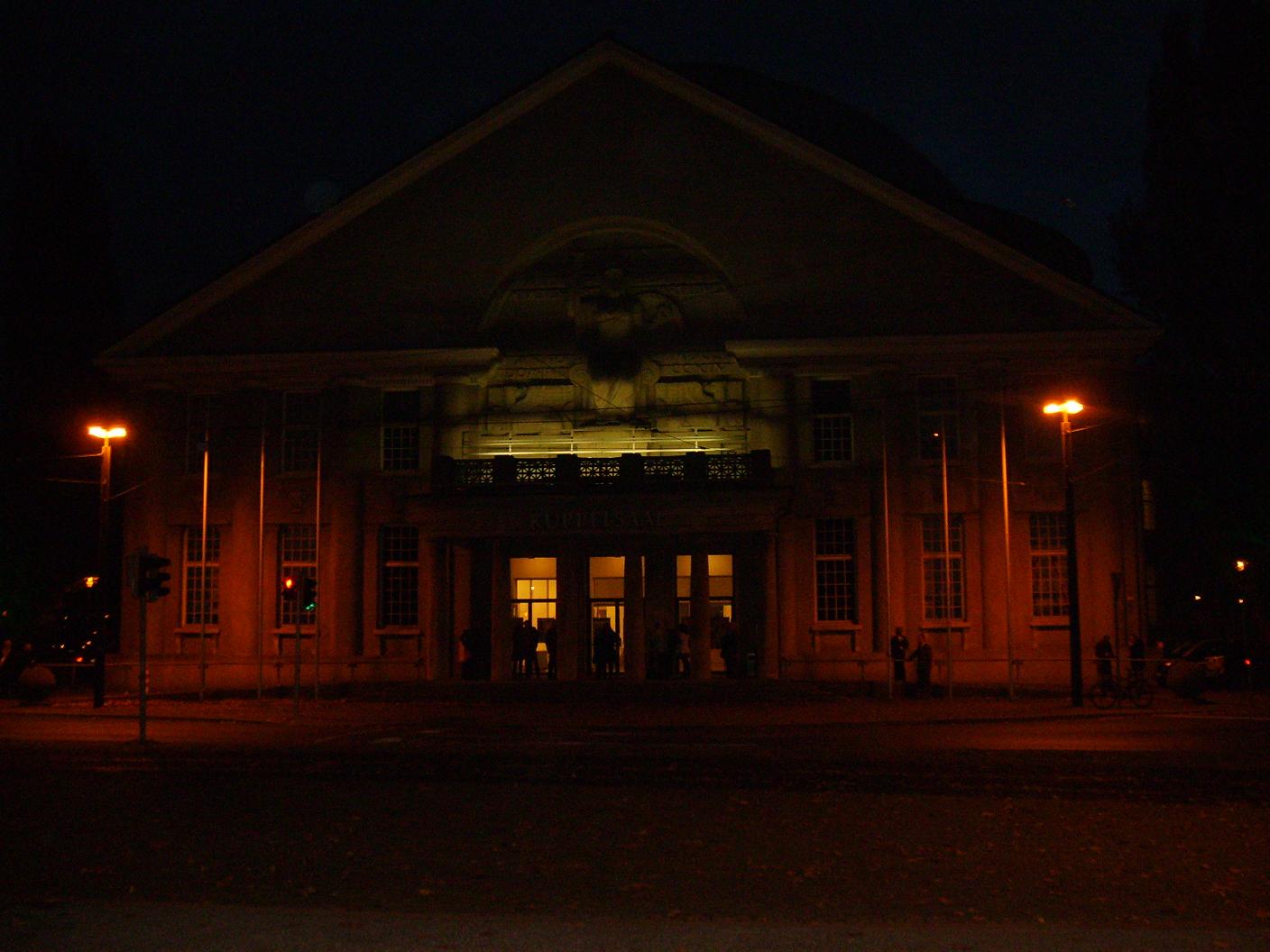 Als Gerd und ich vor dem Kuppelsaal in Hannover ankamen, war es schon ziemlich dunkel. Parkplatz gesucht. Auto abgestellt und zu Fuß einen geeigneten Blickwinkel für das erste Bild gesucht. Mitten auf einer riesigen Rasenfläche stand ich dann und knipste drauf los. Kuppelsaal von vorn.