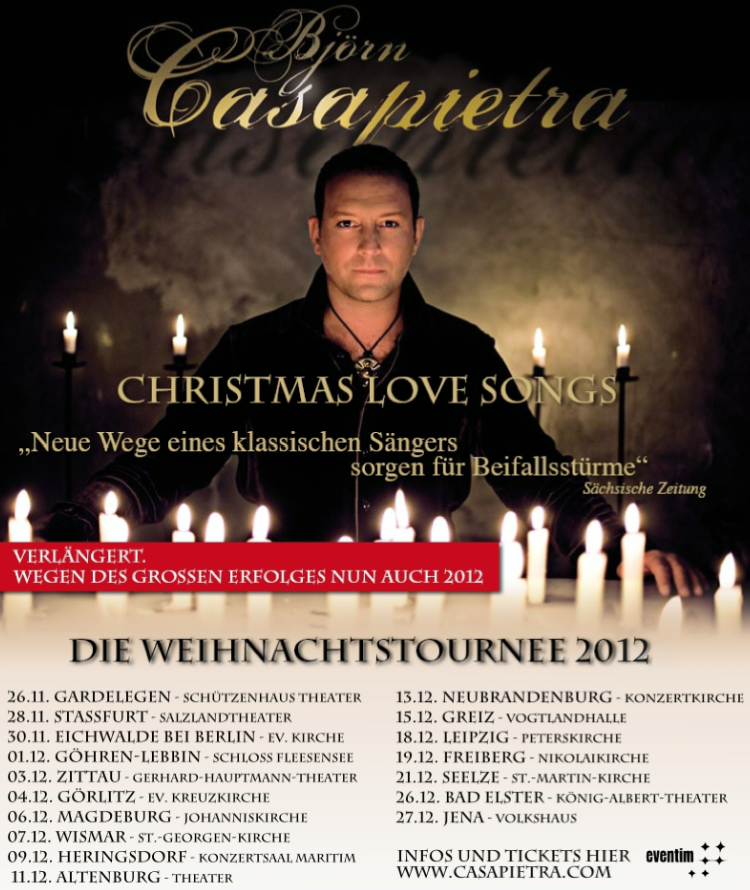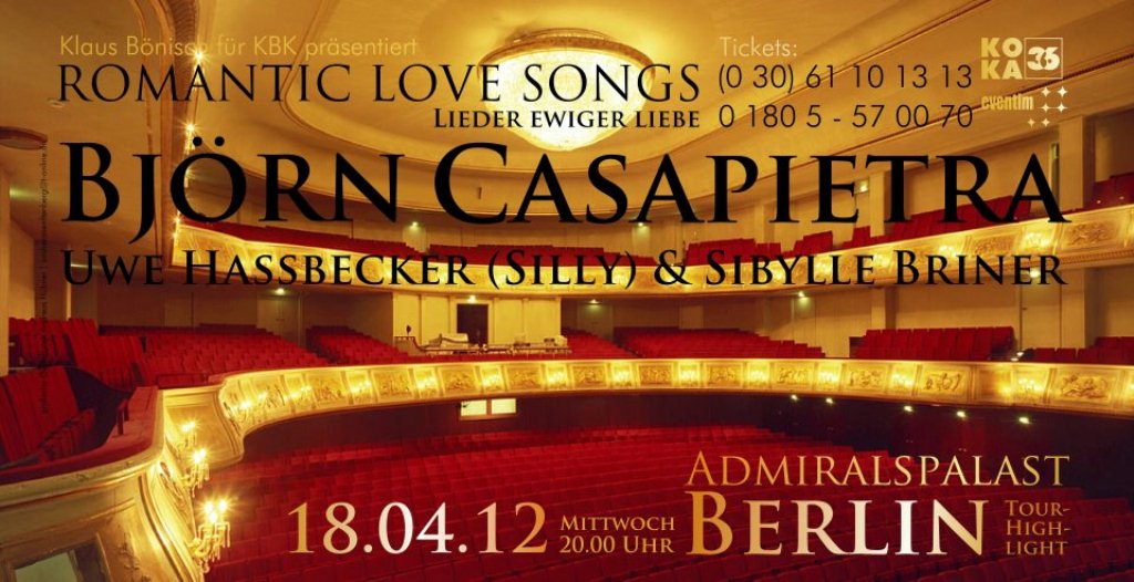 Björn Casapietra in Begleitung von seinem Halbbruder dem Gitarristen Uwe Hassbecker und der Schweizer Pianistin Sibylle Briner, die auch ihre Liebe zum Singen entdeckt hat und dem hinzu gewonnen Stargast dem ebenfalls sehr bekannten Dirk Michaelis geben sich die Ehre im Admiralspalast am 18.04.2012 in Berlin aufzutreten.